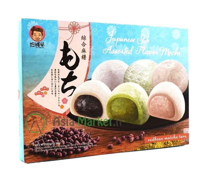 Mochi ai fagioli rossi: Maltosio, Crema di Fagioli Adzuki Rossi (Fagioli Adzuki Rossi, Maltosio, Zucchero, Olio di Soia, Aroma) (20%), Farina di Riso Glutinoso (15%), Zucchero, Fecola di Patate, Acqua, Conservante: E202, Emulsionante: E471, Addensante: E415.