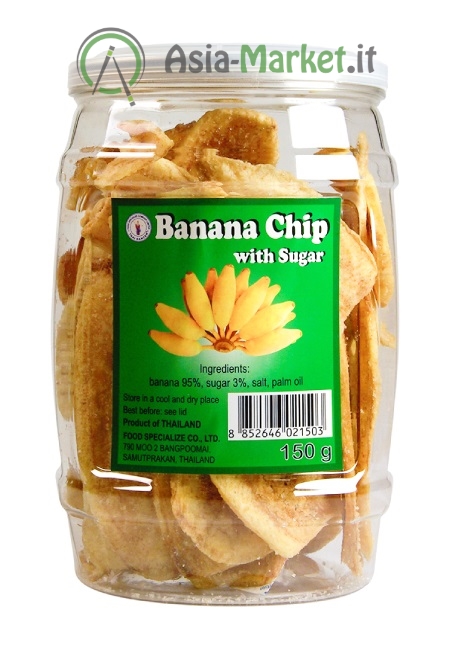 Queste chips croccanti sono fette lunghe e sottili di banana, fritte in olio vegetale, con un po' di zucchero ed un pizzico piccolissimo di sale. Uno snack dolce e stuzzicante adatto a qualsiasi momento della giornata.
