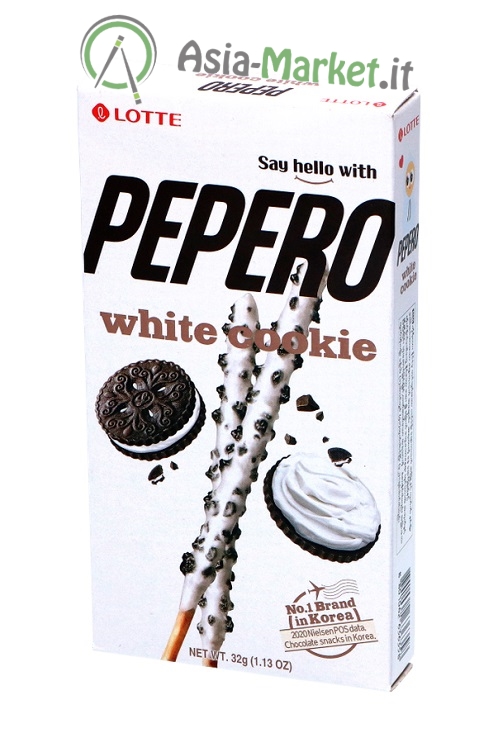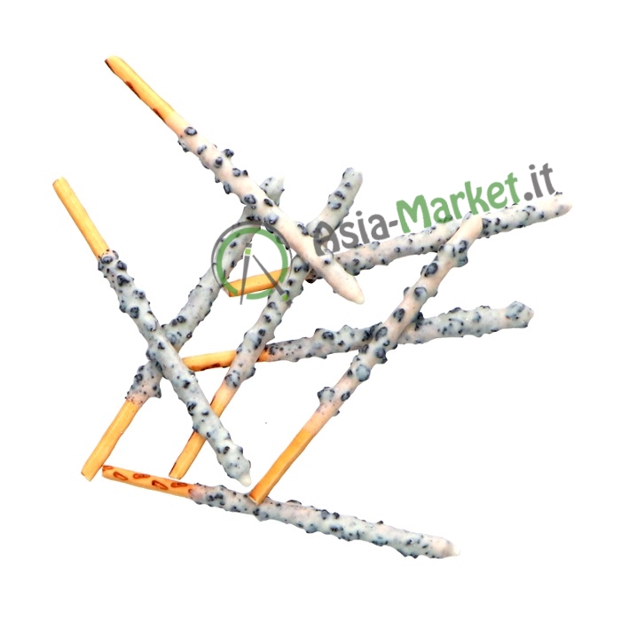 In questo gusto "White Cookie" questi piccoli grissini croccanti sono ricoperti di crema al latte e burro di cacao con pezzettini di biscotti al cacao (tipo Oreo).