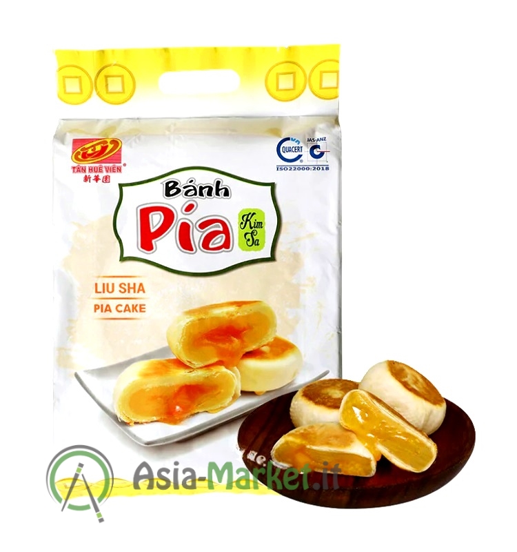 Queste "Liu Sha Pia Cake" (dove "pia" probabilmente ebbe origine dall'inglese "pie", che significa ugualmente torta) sono una versione moderna del dolce vietnamita Bánh Pía della provincia di Sóc Trăng. A differenza del classico ripieno di pasta di fagioli mungo e Durian, la variante "Liu Sha" non contiene il frutto odoroso ma un cuore di crema fondente a base di tuorlo d'uovo salato. Infatti il termine è proprio preso dal cinese ( 流沙 ) in cui si traduce letteralmente in "sabbie mobili" o "flusso di sabbia", riferito al ripieno fluido e "magmatico" (come fosse lava) di crema all'uovo che cola quando la tortina viene riscaldata e poi aperta a metà. Si usa anche la parola "Kim Sa" ( 金沙 ), cioè "sabbia dorata", per evocarne la brillantezza.