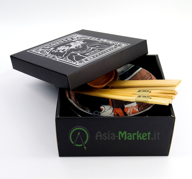 Set of 2 Ramen Bowls, 2 Pairs of Wooden Chopsticks and 2 Wooden Spoons - "Geisha/Matsuri" Fantasy