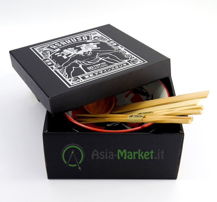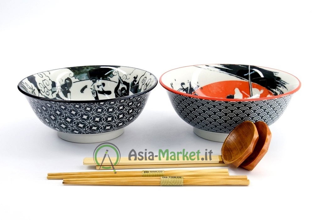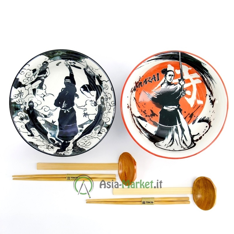Set of 2 Ramen Bowls, 2 Pairs of Wooden Chopsticks and 2 Wooden Spoons - "Samurai/Ninja" Fantasy