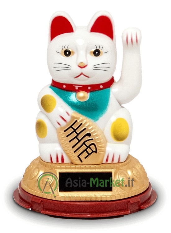Sulla base c'è la batteria ad energia solare che farà muovere come cenno di saluto la zampa sinistra del gatto. Davanti sono incisi ideogrammi cinesi con significato l'augurio di buona fortuna.